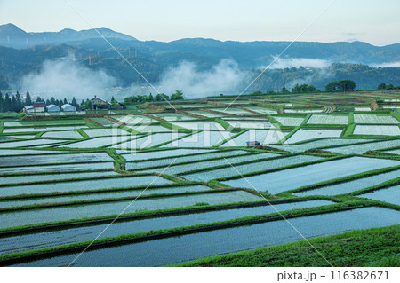 新潟松代星峠 朝霧と残雪の棚田
