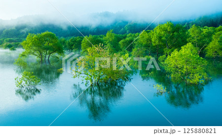 朝焼けに染まる磐梯山と朝靄に包まれる五色沼