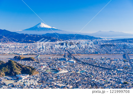 (静岡県)午後の日差しを受ける、静岡市の街並みと富士山