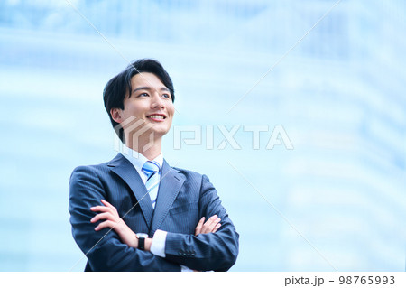 オフィスビルにいるスーツ姿の若いアジア人ビジネスマン