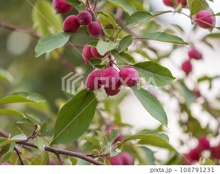 Bright red small wild apples among the yellow leaves in autumn.