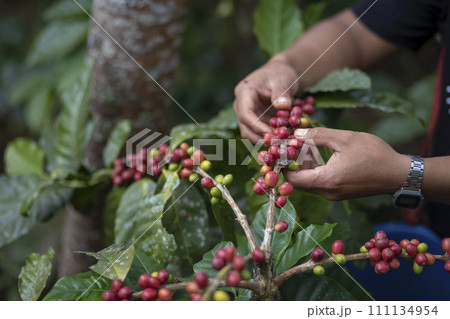 Man Hands harvest coffee bean ripe Red berries plant fresh seed coffee tree growth in green eco organic farm. Close up hands harvest red ripe coffee seed robusta arabica berry harvesting coffee farm
