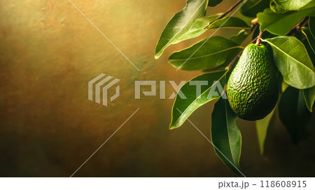 Fresh green avocado growing on tree branch with leaves