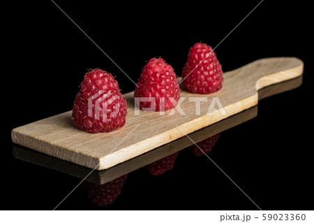 Fresh red raspberry isolated on black glass