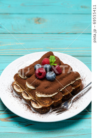 portion of Classic tiramisu dessert with raspberries and blueberries on blue wooden background