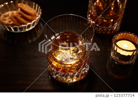 木目テーブルの上の丸い氷のウィスキーオンザロックとおつまみ