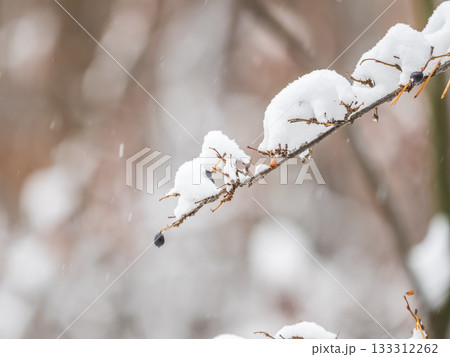 Tree branches in winter covered with snow and frost in snowfall. Frozen tree branches.