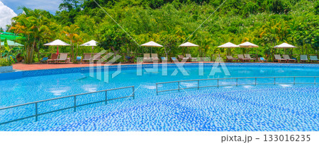 swimming pool at a tropical luxury resort by sea in summer. Tourism and recreation. Landscape panorama with a pool and sun loungers and umbrellas
