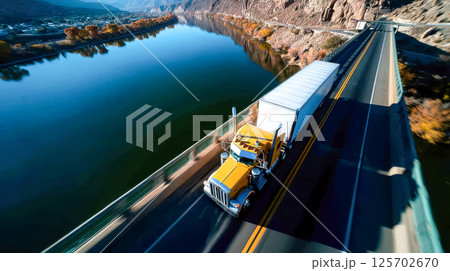 A bright yellow semi-truck driving across a scenic bridge over a calm river with mountains and autumn trees in the background