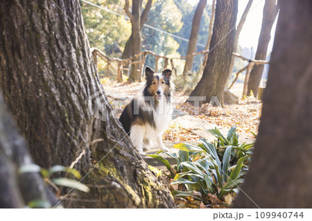 遊歩道のある公園でお座りをして木の間から見つめる犬 シェルティー