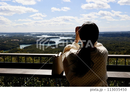 横山展望台の木もれ日テラスでスマホで写真撮影する女性