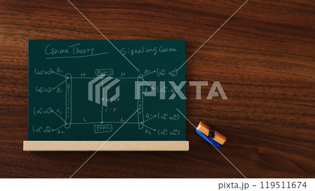 大学の経済学部で勉強するゲーム理論の数理モデル:数学のゲームの木が描かれた黒板と木目背景