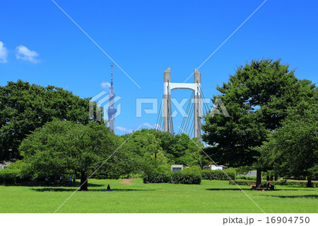 東京都江東区の木場公園大橋とスカイツリー