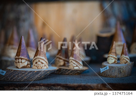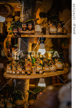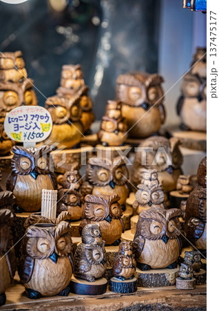 北海道阿寒・アイヌコタンに並ぶ木彫りの民芸品と伝統工芸の風景