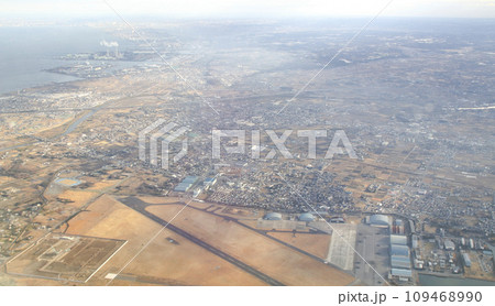 千葉県房総半島の陸上自衛隊木更津駐屯地飛行場と木更津市街地を東京湾上空から望む
