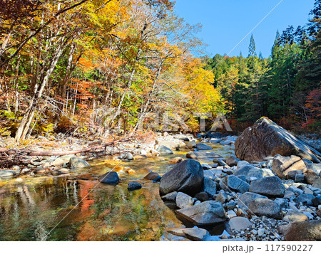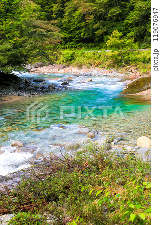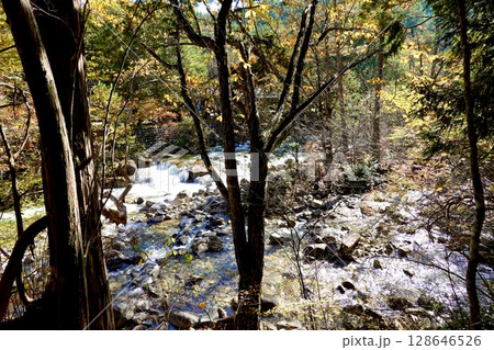 赤沢自然休養林のふれあいの道から見た川のせせらぎの風景 長野県木曽郡上松町