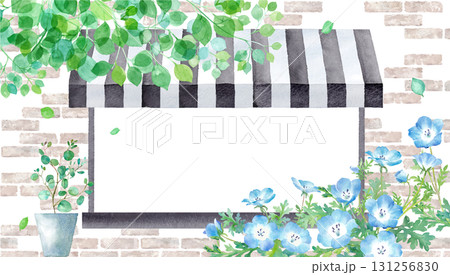 レンガ壁とお店窓を背景にした、新緑の枝葉とネモフィラの水彩イラスト。春のナチュラルなフレームデザイン