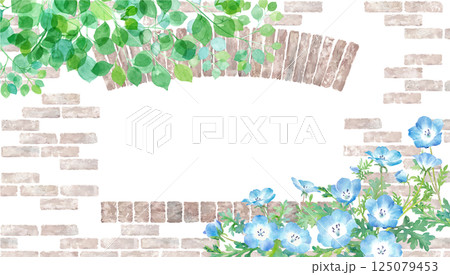 レンガ壁と窓を背景にした、新緑の枝葉とネモフィラの水彩イラスト。ナチュラルなフレームデザイン。