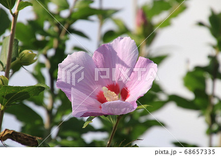 青空に映えるピンク色の木槿(ムクゲ)の花