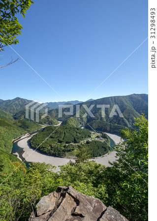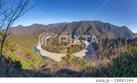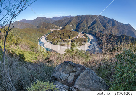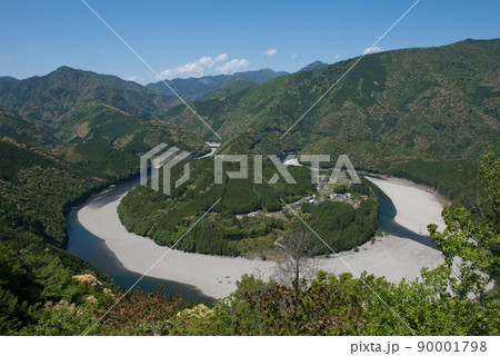 紀伊半島の三重県新宮市から観える馬蹄形(ホースシューベント)の熊野川町木津呂集落の景色