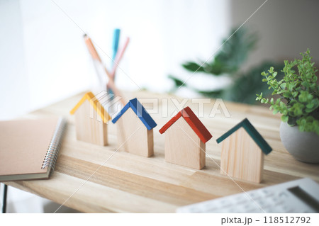 複数並んだカラフルな屋根の家とビジネスアイテム