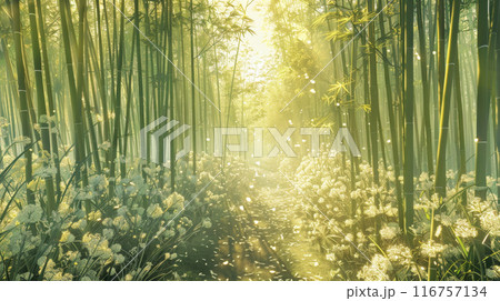 Thickets of bamboo grove with sunlight through the trunks, early morning