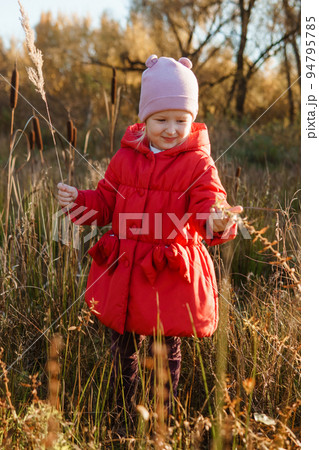 A little girl in a red coat walks in nature in an autumn grove. The season is autumn