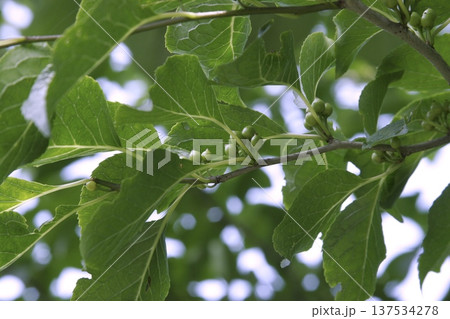 アオハダ(学名:Ilex macropoda)の若い果実 夏の雑木林 東北