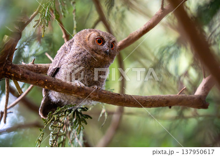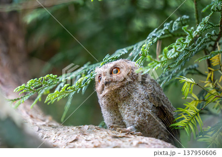 森に佇むミミズク ふくろう 猛禽類 ベンガルワシミミズク 雛