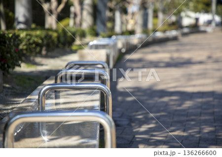 整然と並んだ手すりが金属製のベンチ