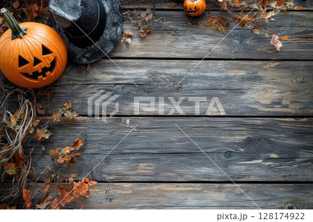 A wooden table with a black hat and two pumpkins on it