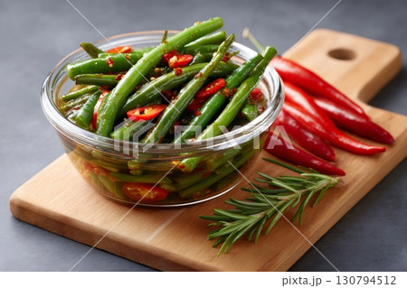 Spicy green beans salad with chili pepper and rosemary