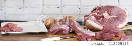 Different tipes of meat cutting fresh raw meat on board in white kitchen. Preparing pork meat, cooking, banner,