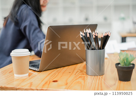 Close-up of a work desk with a laptop, a cup of coffee, pencils, and a small potted plant, exemplifying a contemporary workspace.