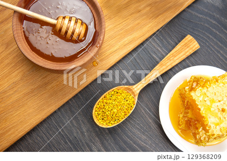 A rustic wooden table displays a bowl of golden honey with a wooden dipper, a plate of honeycomb