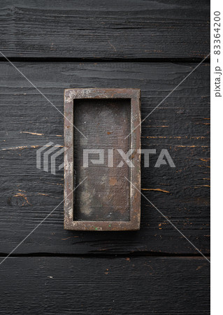 Empty wooden box with copy space for text or food, top view flat lay , on black wooden table background