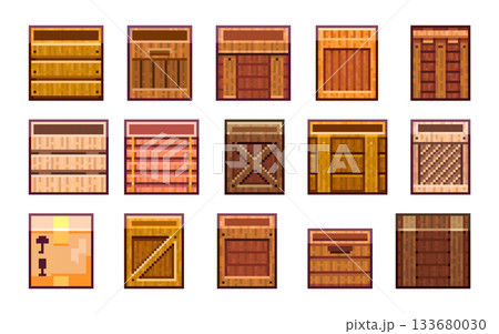 Pixel Art Crates Collection. 8bit Wooden Game Boxes Tileset and Spritesheet Assets for Platformer Levels, Inventory and Retro UI.