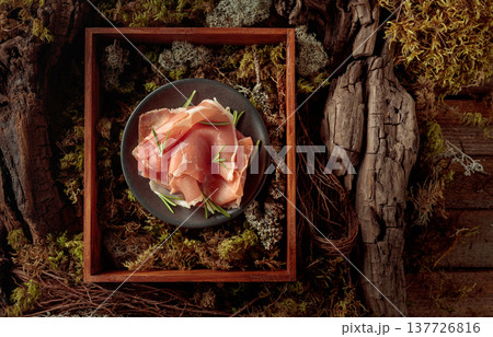 Prosciutto with rosemary on a black plate in abstract natural composition.