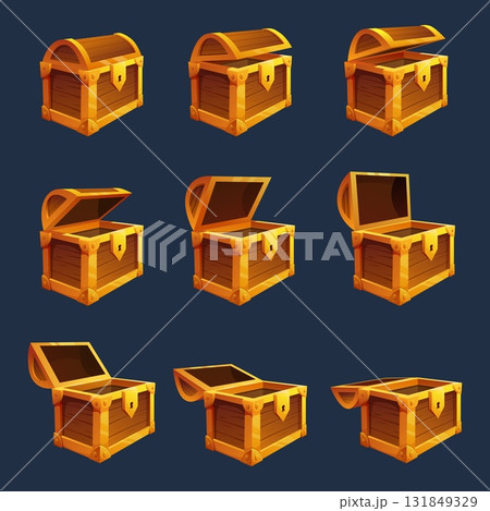 Wooden chest. Animation of opened and closed pirate chest for coins, jewelry, treasure. Interior element of medieval castle or palace for riches, sapid vector set