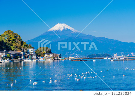 穏やかな湾内で休むカモメの群れと富士山