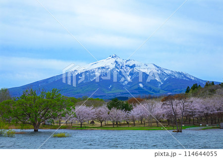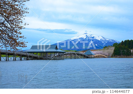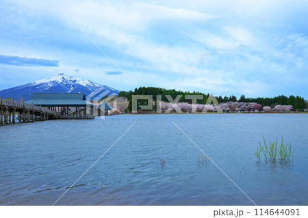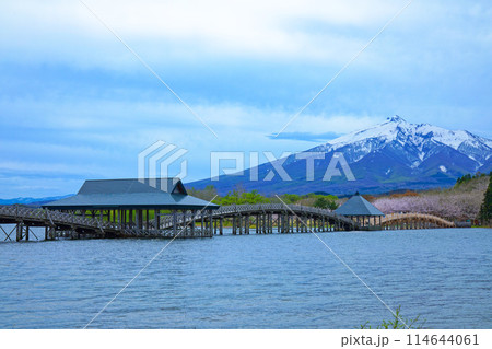 鶴の舞橋と岩木山 満開の桜 丹頂鶴