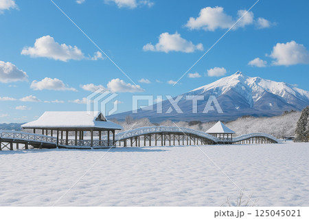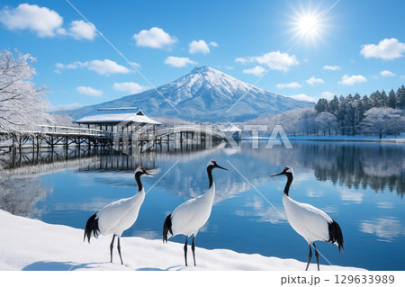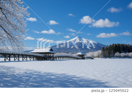 雪景色の鶴の舞橋と岩木山 丹頂鶴
