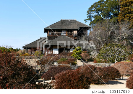 【水戸市「偕楽園」好文亭の木造二層三階建ての外観】