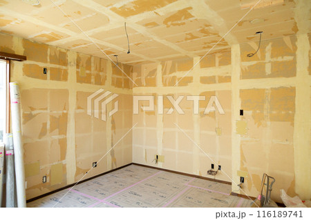 壁のクロスを剥がされて下地が剥き出しになった住宅