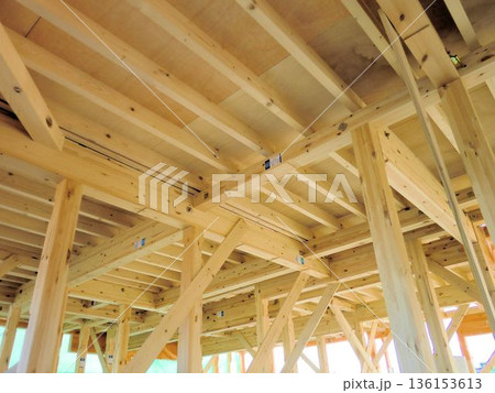 木造住宅の梁と柱が組まれた内部構造(建築中の躯体)