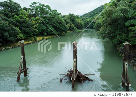 伊勢神宮 内宮 宇治橋から見る木除杭と五十鈴川 三重県伊勢市