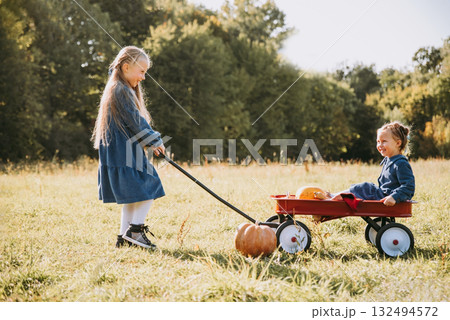 Autumn harvest organic pumpkins and apples. Happy little sisters girl on pumpkin patch on cold autumn day, with lot of pumpkins for halloween or thanksgiving and red wagon. Children on pumpkin field.