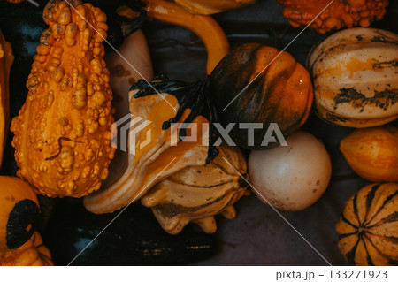 Colorful ornamental gourds and pumpkins in rustic autumn setting. Seasonal harvest background with vibrant texturesThanksgiving, Halloween, fall decorations, organic farming, and cozy lifestyle themes