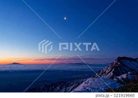 北アルプス・穂高岳稜線から見る夜明けの浅間山