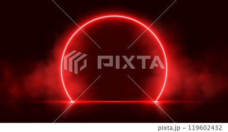 Neon arch with smoke, red glowing portal, futuristic circle gate, magic stage with vapor.